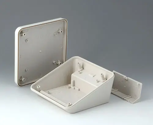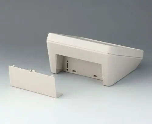 Boitier en matière plastique à trois éléments, au design moderne et avec une inclinaison ergonomique de la surface de visualisation et de commande. Le couvercle compris dans la fourniture permet de fermer visuellement la zone interfaces et/ou d’installer d’autres composants électroniques dans un espace à part. Bossages de fixation pour les circuits imprimés et composants dans les parties supérieure et inférieure. Support mural et joint (pour accroître le degré de protection jusqu’à IP 65) dans la gamme des accessoires. Visseries avec vis inox et entrainement Torx dissimulées. Également utilisable en extérieur grâce au matériel haut de gamme et la construction robuste.