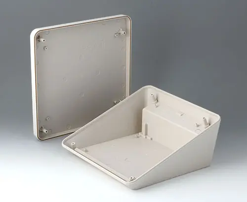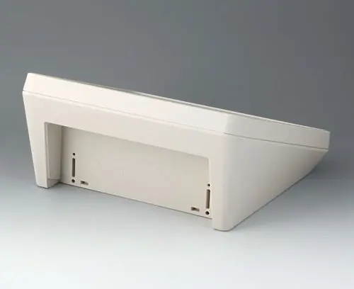 Boitier en matière plastique à deux éléments, au design moderne et avec une inclinaison ergonomique de la surface de visualisation et de commande. Bossages de fixation pour les circuits imprimés et composants dans les parties supérieure et inférieure. Zone interfaces en retrait. Support mural et joint (pour accroître le degré de protection jusqu’à IP 65) dans la gamme des accessoires.