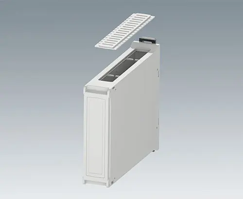 RAILTEC BP, M22, panneau latéral fermé et panneau latéral avec aération Boitier pour rail DIN avec un panneau latéral fermé, un panneau latéral avec aération et face avant clipsables. Connexions possibles sur 3 côtés. Pour des borniers fixes ou enfichables : 2 x 16 broches, pas de 5,08 mm. Montage simple et rapide sur rails DIN EN 60715 TH35. Ce nouveau modèle sans vis facilite l’intégration des composants électroniques et l'assemblage.