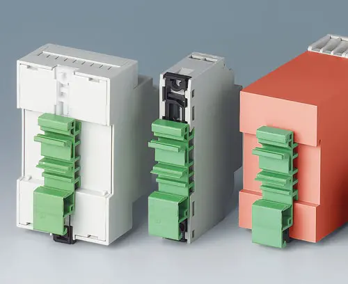 RAILTEC C, 1 module, Vers. II Boitier avec 2 côtes ouverts - pour 2 couvre-bornes (acc.) max. Conçu pour la fixation sur barrettes DIN EN 60715 (TH35). Guides verticaux et horizontale pour l'introduction du circuit imprimé. Assemblage par simple encliquetage des éléments du boitier. Couvre-bornes, plaque avant voir accessoires.