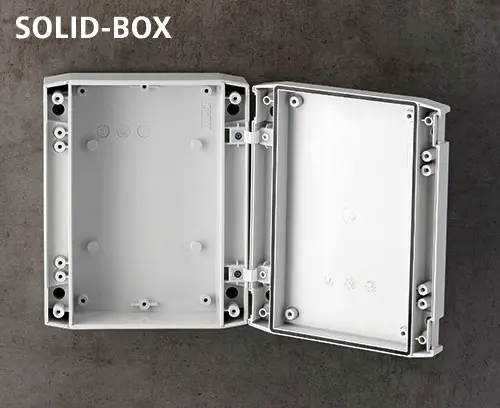 SOLID-BOX 115 Boitier industriel fonctionnel de haute qualité - robuste, étanche et élégant à la fois ! Surface du boitier polie brillante avec cache-vis design permettant un vissage dissimulé du boitier en dehors de la zone d'étanchéité. Le joint est déjà inséré dans la partie supérieure. Zone en retrait pour protéger un clavier à membrane ou une étiquette design.