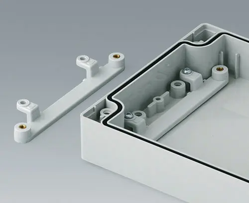 ROBUST-BOX 120 LARGE, Vers. II Boitier en plastique robuste, prédestiné aux applications électriques et électroniqus. Coquilles du boitier utilisable comme partie supérieure ou inférieure au choix. Dans chaque partie du boitier il se trouvent des filetages et bossages de fixation. Vissage hors la zone étanche. Creux d'environ 0,8 mm min. pour l'utilisation des claviers.