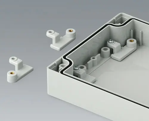 ROBUST-BOX 200 LARGE, Vers. I Boitier en plastique robuste, prédestiné aux applications électriques et électroniqus. Coquilles du boitier utilisable comme partie supérieure ou inférieure au choix. Dans chaque partie du boitier il se trouvent des filetages et bossages de fixation. Vissage hors la zone étanche. Creux d'environ 0,8 mm pour l'utilisation des claviers.