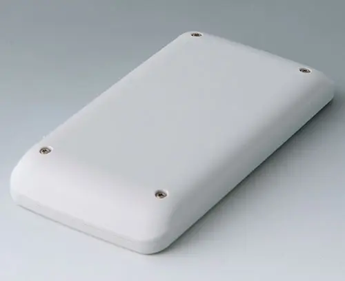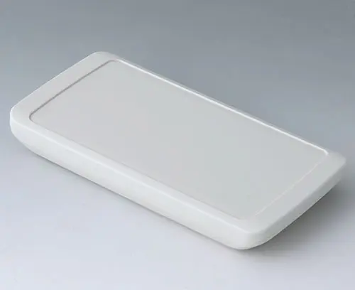 Boitier manuel en deux parties, de conception plate avec une grande surface de commande allant jusqu'à 4 “ (10 cm). Contours latéraux du boitier arrondis - tient confortablement dans la main et peut être utilisé en toute sécurité. Zone de commande en creux pour les applications avec feuille décorative. Bossages à vis pour circuits imprimés dans la partie supérieure et inférieure. Joint en accessoire pour le degré de protection IP 65.