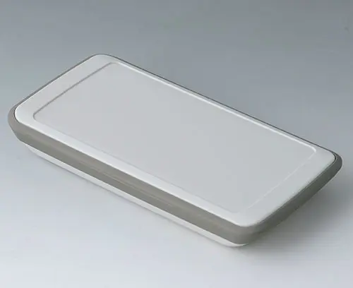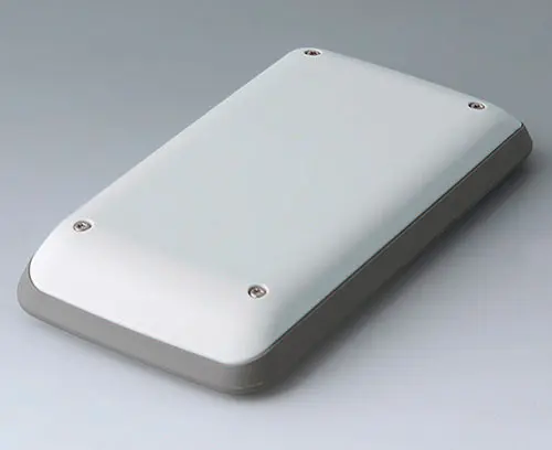 Boitier manuel en trois parties avec bague intermédiaire en TPE, de conception compacte avec une grande surface de commande allant jusqu'à 4 “ (10 cm). Toucher agréable grâce à des contours arrondis sur les côtés et une bague intermédiaire en TPE qui sert en outre de protection contre les chocs et de joint d’étanchéité pour le degré de protection IP 54. Zone de commande en creux pour les applications avec feuille décorative. Bossages à vis pour circuits imprimés dans la partie supérieure et inférieure.