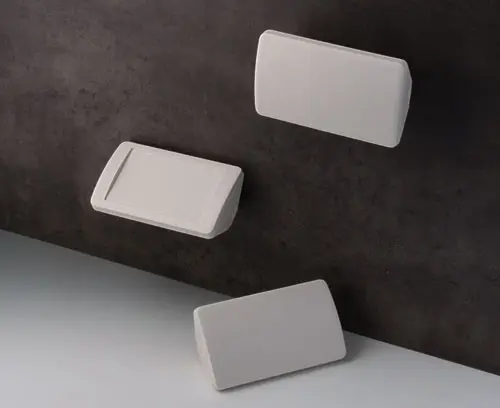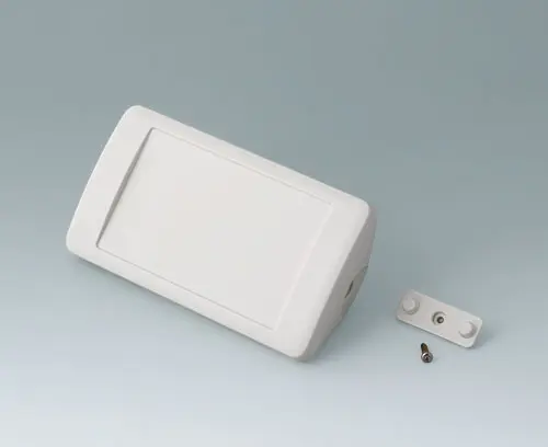 Boitier en matière plastique en deux parties avec une zone en creux pour protéger le clavier à membrane/la feuille décorative. La forme de base triangulaire permet une utilisation dans les coins ou une disposition ergonomique avec un angle de positionnement de 45°. Conception robuste avec un assemblage par rainure et languette qui a fait ses preuves. Vissage avec des vis inox et entrainement Torx. Degré de protection IP 40 sans jeu de joint. Bossages de fixation pour circuits imprimés et composants dans les parties supérieure et inférieure.