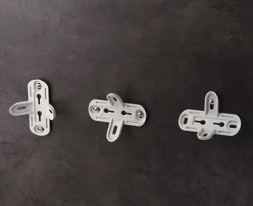 Le support permet une fixation simple et jointive des boitiers dans les coins intérieurs à 90 ° ou au mur. Le montage s’effectue par encliquetage sur l’adaptateur (accessoire de boitiers complets).