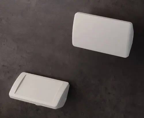 SMART-CONTROL S, Vers. I Boitier en matière plastique avec une partie supérieure courbe convexe. La forme de base triangulaire permet une utilisation dans les coins ou une disposition ergonomique avec un angle de positionnement de 45°. Conception robuste avec un assemblage par rainure et languette qui a fait ses preuves. Vissage avec des vis inox et entrainement Torx. Degré de protection IP 40 sans jeu de joint. Bossages de fixation pour circuits imprimés et composants dans les parties supérieure et inférieure.