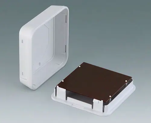 SMART-PANEL S84 Boitier en matière plastique en deux parties, au design noble, avec partie supérieure plate. Bossages de fixation pour circuits imprimés et modules dans la partie supérieure. Partie inférieure aux contours préformés pour la découpe et la fixation sur des boîtes d'encastrement / boîtes cloison sèche (usinage ultérieur nécessaire). Encliquetage sécurisé de la partie supérieure et inférieure, rationnel lors de l'assemblage final. Pour ouvrir facilement les boitiers, nous recommandons d’utiliser les outils de décliquetage pratiques, disponibles en accessoires. Partie en creux pour la protection de clavier. Plaque de papier dur, plaque de verre et feuille adhésive dans la gamme d’accessoires. Grâce au matériau de haute qualité (UL 94 V-0) et aux formes élégantes, il convient parfaitement à une utilisation dans la technologie moderne des bâtiments.