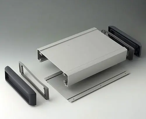 Guides horizontaux pour circuits imprimés et canaux de vissage à l’intérieur du boitier. Surfaces planes pour une intégration aisées d’interfaces. Zone de commande en creux pour la protection d’afficheurs, de claviers à membrane et d’éléments de commande. Couvercles latéraux avec zone en retrait pour la protection des câbles et connecteurs.