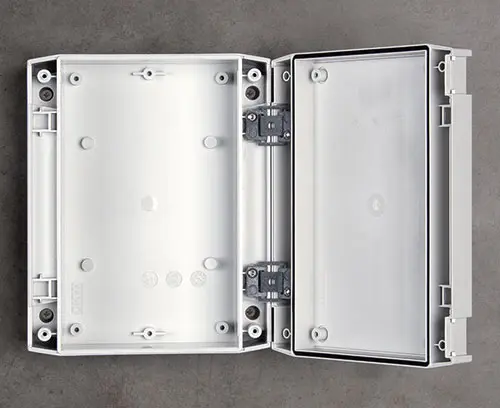 Bossages de fixation pour circuits imprimés ou plaques de montage dans la partie inférieure et supérieure. Partie inférieure avec deux bossages supplémentaires pour la fixation d'un rail DIN ainsi qu'avec des emplacements préformés pour l'utilisation de supports selon le standard VESA 75x75.