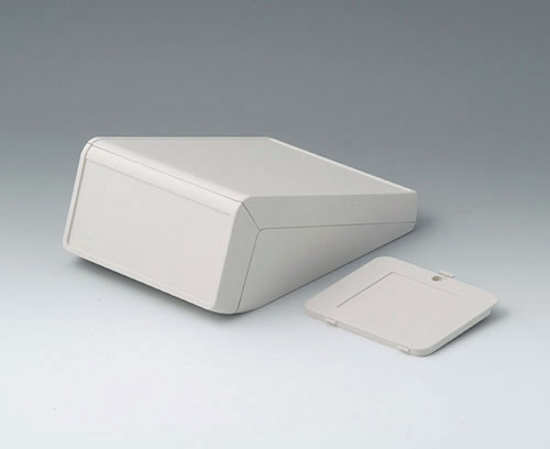 Boitier en plastique avec deux surfaces à éléments de commande et à angle droit l'une par rapport à l'autre, l'utilisation individuelle ou duale. Face avant en creux 1,4 mm. Partie supérieure en creux 0,6 mm. Bossages pour le montage des circuits imprimés dans les parties supérieures, inférieures et face avant.