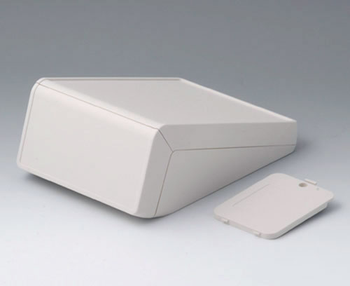 Boitier en plastique avec deux surfaces à éléments de commande et à l'angle droit l'une par rapport à l'autre, l'utilisation individuelle ou duale. Face avant en creux 0,6 mm. Partie supérieure en creux 1,4 mm. Bossages pour le montage des circuits imprimés dans les parties supérieures, inférieures et face avant.